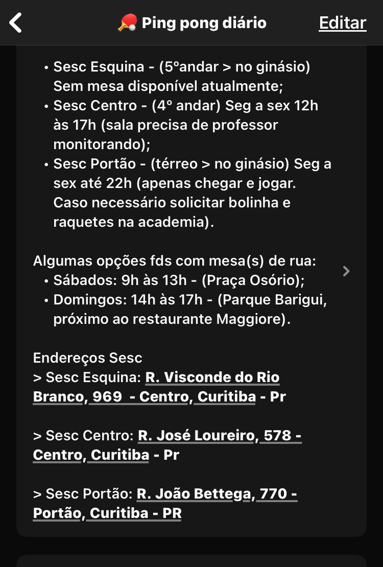 Ciao. Sono Luciano, italiano in vacanza a Curitiba per tre mesi. Avrei piacere di giocare a ping pong, cosa mi suggerite? Grazie